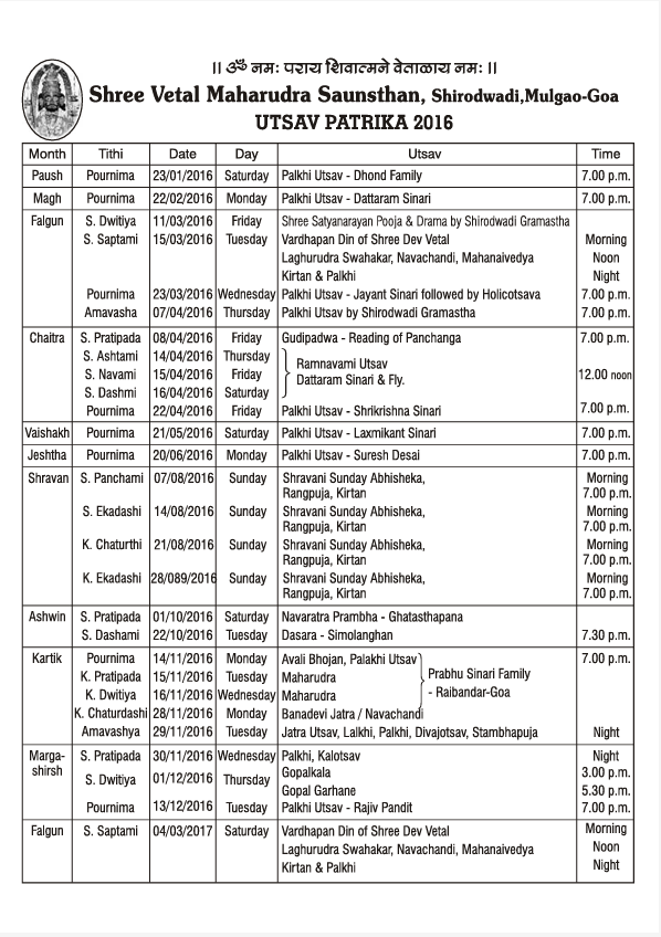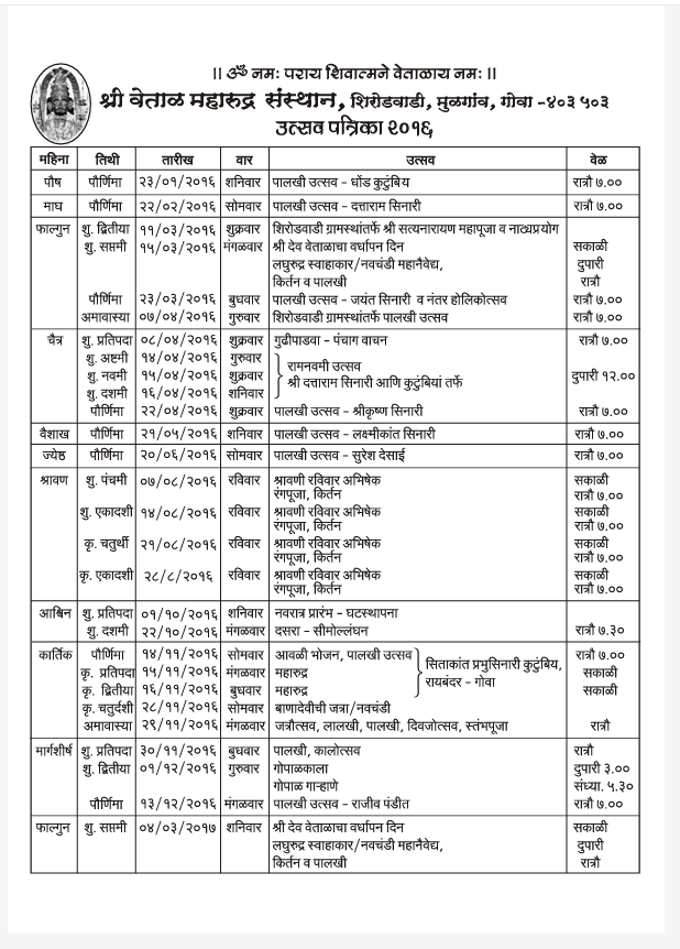 श्री वेताळ महारुद्र संस्थान, शिरोडवाडी–मुळगांव, गोवा येथे साजऱ्या होणाऱ्या वार्षिक उत्सवांची अधिकृत उत्सव पत्रिका खाली दिली आहे.